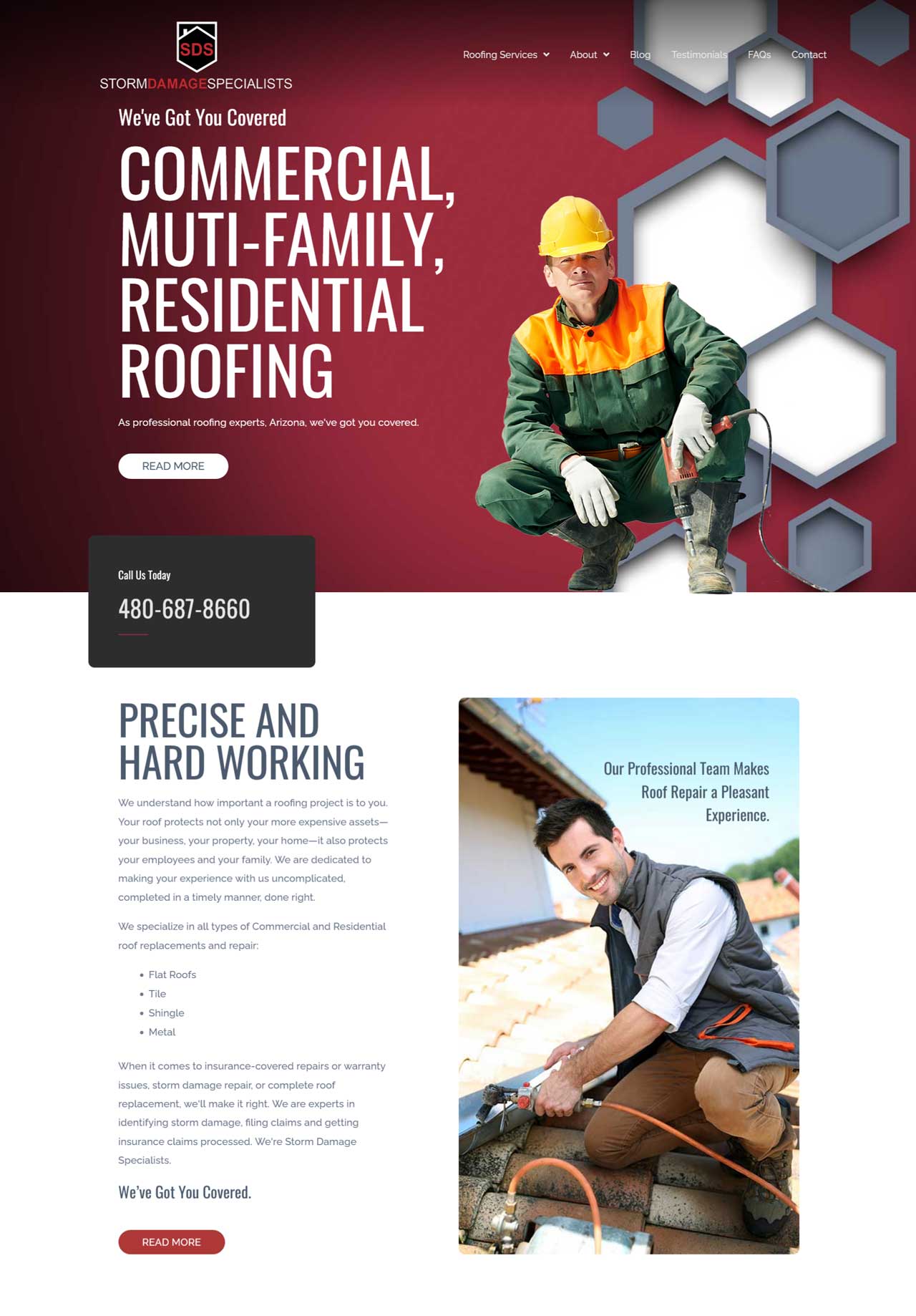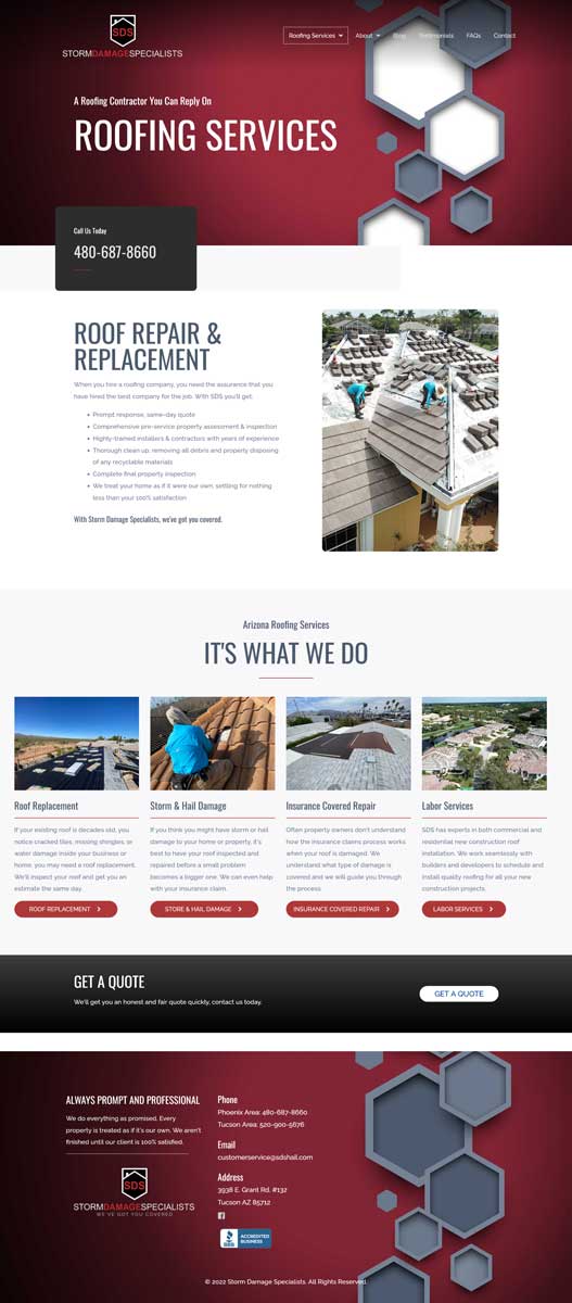 Storm Damage Specialists wanted to reach the greater Tucson and Phoenix markets. They have experience working with a wide range of roofing projects, from 200 to 250,000 square-foot buildings, individual homes to large strip malls and everything in between. They wanted to make their services known to any potential customer looking for roof repair or replacement, as there is no project too big or too small for them to handle. Since most customers come as a result of search engine queries, the SDS website has to rank highly when a prospect makes a relevant search. Like these experienced roofers, many of our other customers face an exceedingly competitive market. In order to grow their client base, we had to help SDS stand out among the many other roofing companies in Arizona.