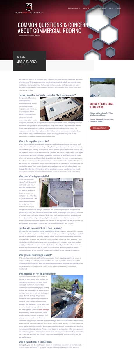 In the case of Storm Damage Specialists, we made sure that their website included pages that fully explained the roofing repair and replacement process from start to finish, and communicated the team’s experience and qualifications that set them apart from the competition. It is crucial to keep the website current by periodically updating and adding new content. Each new piece of content is always sent to the client for approval and feedback before posting.